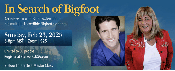 Sunday, February 23, 2025 from 6 – 8 p.m. Mountain Time. The event will be held live on Zoom, and is open to the first 30 participants. The master class cost is $25. Click on the link to reserve your spot today! https://starworksusa.com/blog/in-search-of-bigfoot#sthash.uRLUDJDt.dpbs